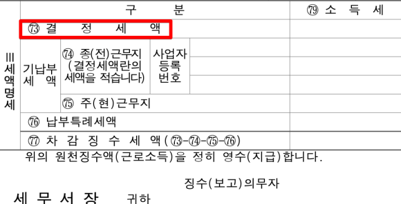 소득공제신고서 하단에 보면, 73번 항목에 결정세액이 표기되고요, 75번은 현근무지 기납부세액, 77번이 결정세액(73번)에서 기납부세액(75번)을 차감한 차감징수세액이 됩니다.