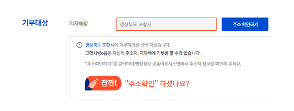 기부절차에서 지역선택 후 주소 확인하기를 통해 기부가능지역을 다시한번 확인할 수 있습니다.