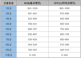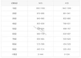 신용점수는 1부터 1000점까지 있으며, 신용평가사에 따라 등급이 다를 수 있습니다. 일반적으로 900점 이상은 1등급, 800점 이상은 2등급으로 분류됩니다. KCB와 NICE의 등급표는 조금씩 다르므로, 두 평가사의 등급표를 참고하여 자신의 신용등급을 확인하는 것이 좋습니다.