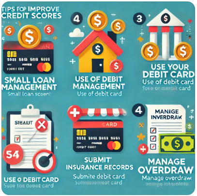 - 체크카드 사용: 체크카드를 30만원 이상 6개월 이상 사용하면 신용점수에 긍정적인 영향을 미칩니다.