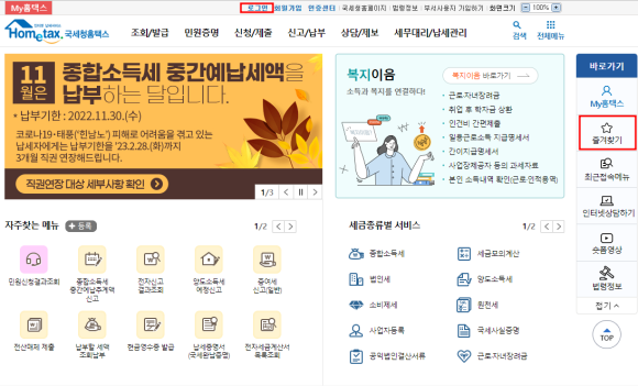 홈택스 우측에 즐겨찾기 메뉴에 추가해서