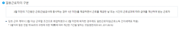 - 일용근로자 = 3개월 미만의 기간동안 근로를 제공하면서 제공한 일수 또는 시간의 성과에 따라 급여를 받는 근로자