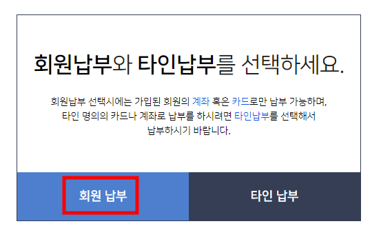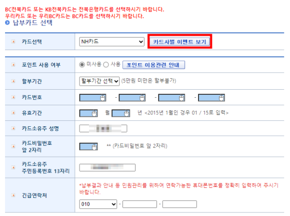 - 카드선택, 카드번호입력, 유효기간, 비밀번호 입력 후 하단 납부하기 클릭