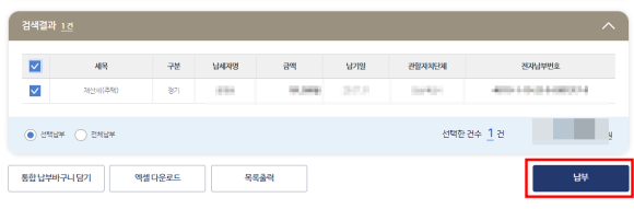 - 해당 지방세(재산세)납부 체크 후 하단 납부클릭