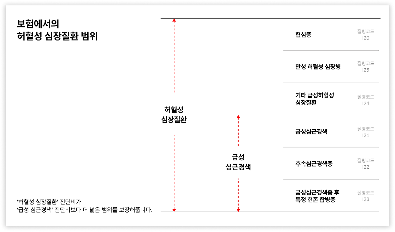 - ‘급성심근경색 진단비’는 ‘허혈성 심장 질환 진단비’보다 보험금 청구 가능한 질병 범위가 좁기 때문이에요 (아래 이미지를 참고해 보세요)