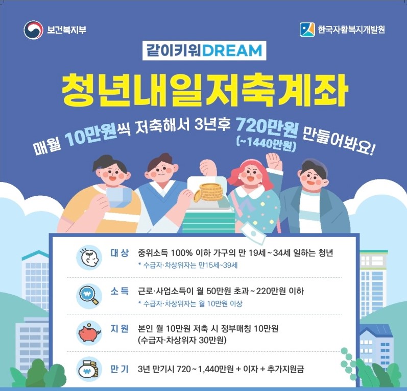청년내일 저축계좌 본인 저축액(월 10만 원 이상)+근로소득장려금 (정부지원금 10만 원) 단, 수급자·차상위 청년은
