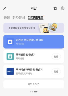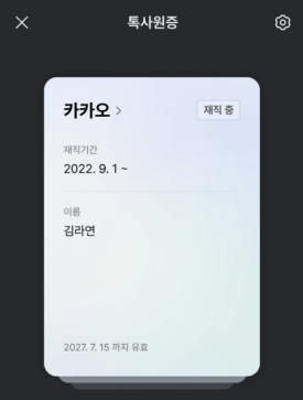 • 톡사원증 확인: 지갑 메뉴에서 '톡사원증' 항목을 선택하면, 발급된 디지털 사원증을 확인할 수 있습니다.